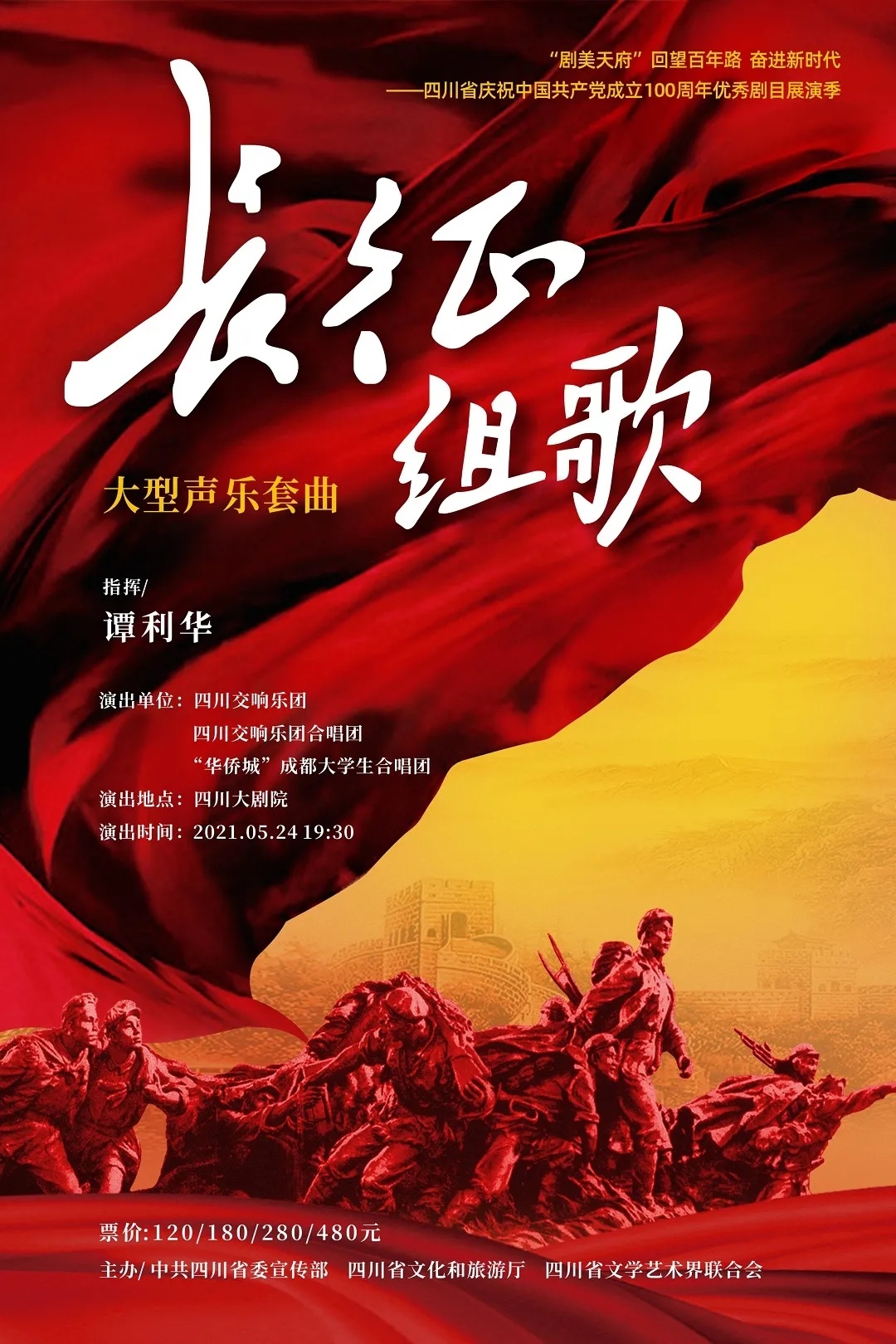 时隔近60年,著名指挥家谭利华将携手四川交响乐团、四川交响乐团合唱团、“华侨城“成都大学生合唱团,5月24日晚将在四川大剧院上演大型声乐套曲《长征组歌》,登台“剧美天府"回望百年路、奋进新时代”——四川省庆祝中国共产党成立100周年优秀剧目展演季,120人的合唱队伍将在交响乐的伴奏下,用歌声为观众们重拾长征峥嵘岁月。