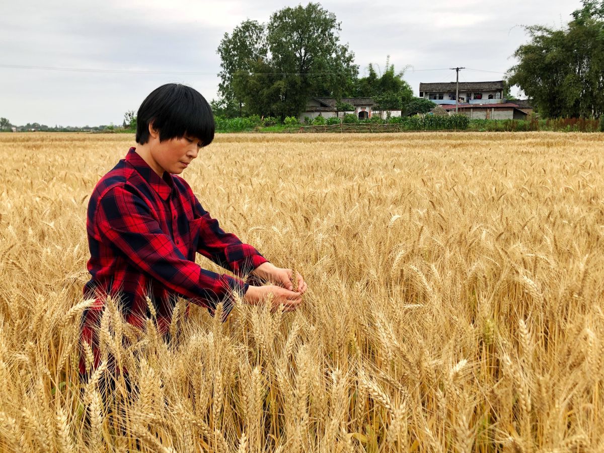 伍碧华在田间查看“蜀麦133” 杜铠兵 摄