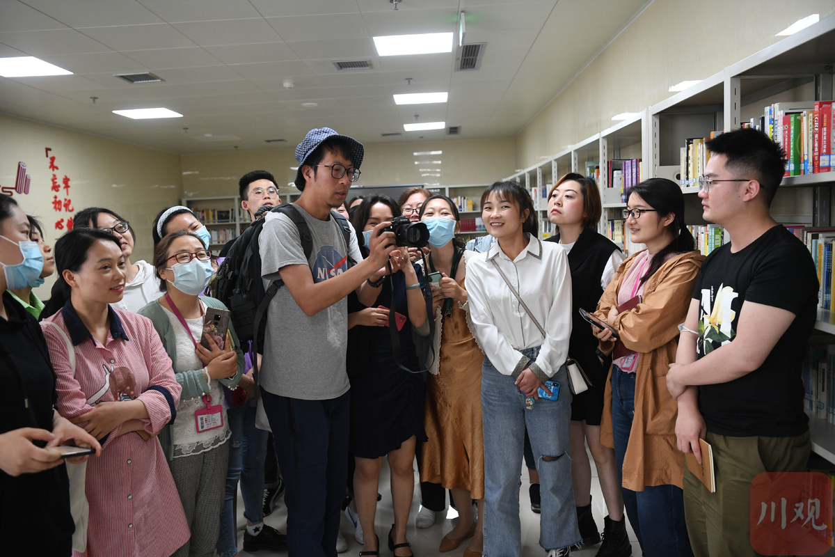 四川日报全媒视觉中心记者郝飞带领学员在该院图书馆进行摄影练习。