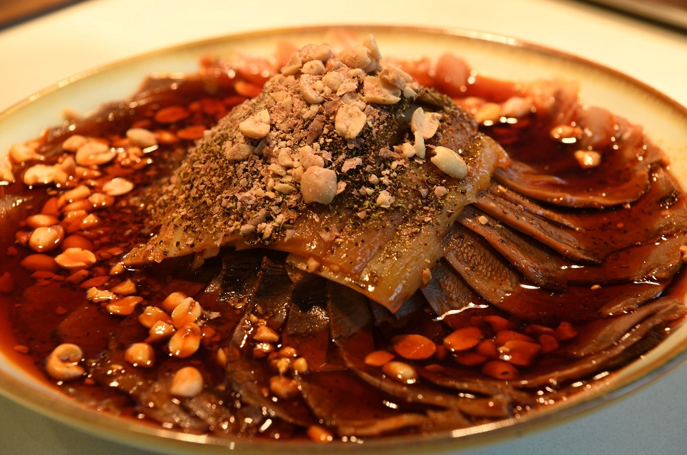 精湛的刀工把煮好的各类材料片成厚薄均匀、大小相近的薄片,盘底铺上芹菜打底,把片好的肉片分类摆成一圈“风车车”,从顶上浇下几大勺特制卤水,几勺鲜亮的红油,再加上添加中药熬制出的秘制料油,最后放上喷香的花生……在位于总府路的夫妻肺片总店里,厨师长胡飞的妙手之下,乏人问津的牛头皮、牛心、牛舌、牛肚等“废料”,瞬间华丽转身,成为彻底唤醒味蕾的四川名菜。作为一道凉菜,这样的色香味一上桌,足以让人胃口大开。