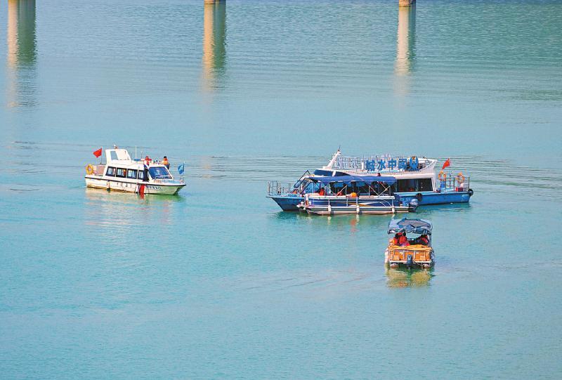 5月10日,阆中市在嘉陵江上举行防洪抢险救灾演练。图①为救援船只将“失控游船”拖往安全区域。 王玉贵 摄(视觉四川)