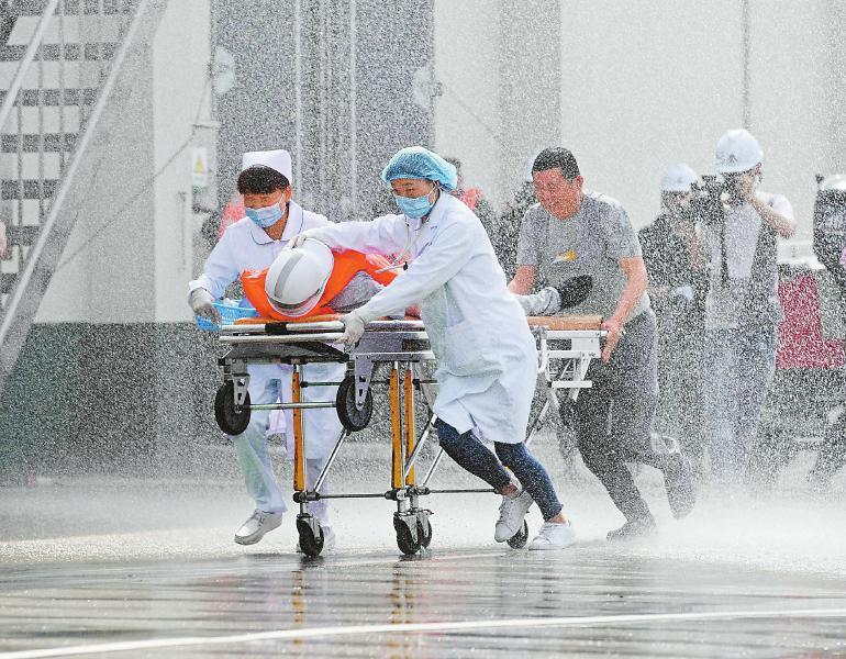 5月10日,由中储粮集团公司主办,成都市青白江区政府和青白江仓储公司承办的政企联合防汛演练,对政企联合救援进行了预演。图②为医务人员转移救助“伤员”。 记者 肖雨杨 摄