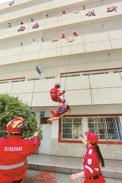 5月10日,绵阳蒲公英救援队联合涪城区红十字应急救援队,在绵阳航空职业学校内开展抗震防震避险逃生演练以及高空救援演练。 陈冬冬 摄(视觉四川)