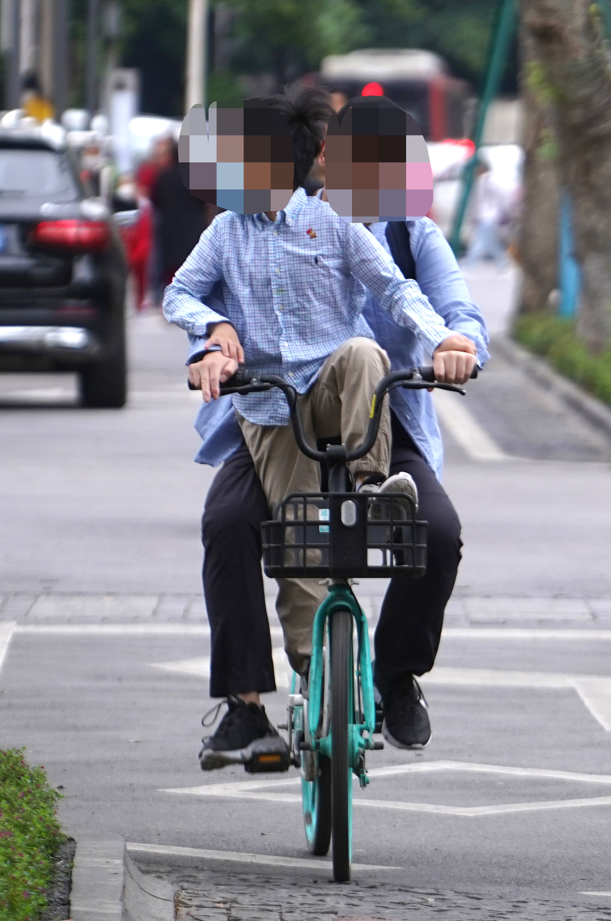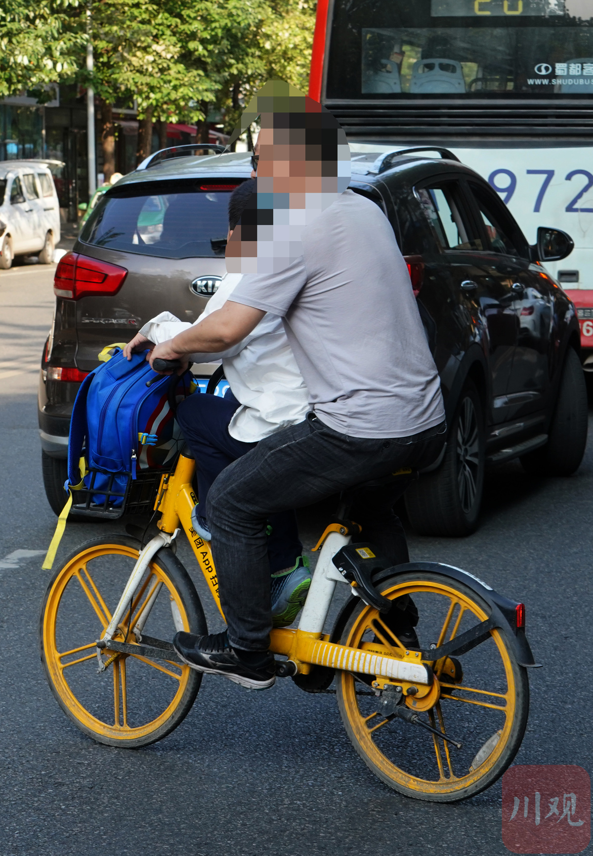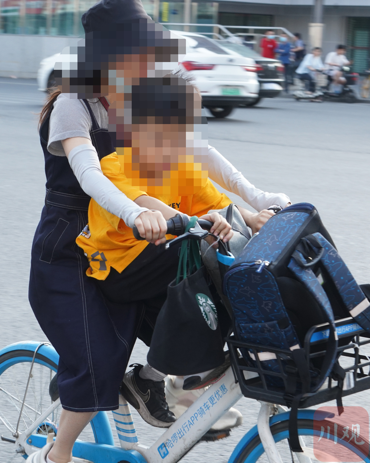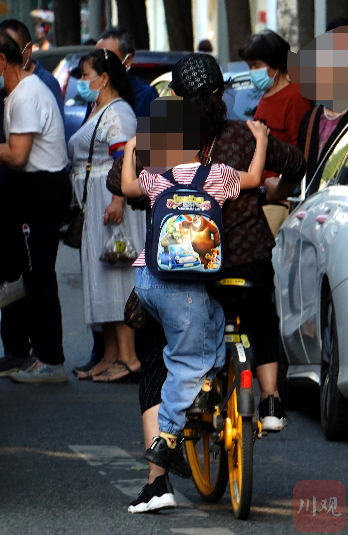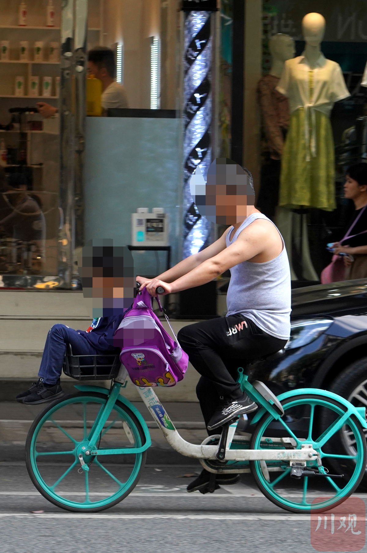 记者在街头看到,为了在共享单车上搭载孩子,除了让孩子坐车筐外,一些家长想出了更大胆的办法,有的让孩子站在车辆横杠上“金鸡独立”,有的和孩子共挤一个单车坐垫。