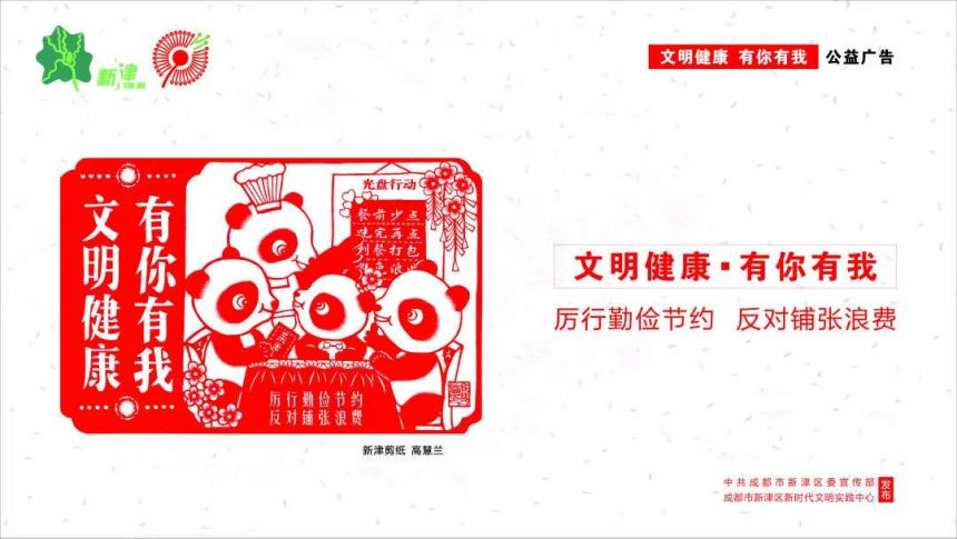 这幅作品以国宝大熊猫为主体,刀工浑然天成,也突出了厉行节约的主题。一张张普通的大红纸,也随着剪刀的一起一落,一浅一深,被寄予了一个个深情的祝福和希望。