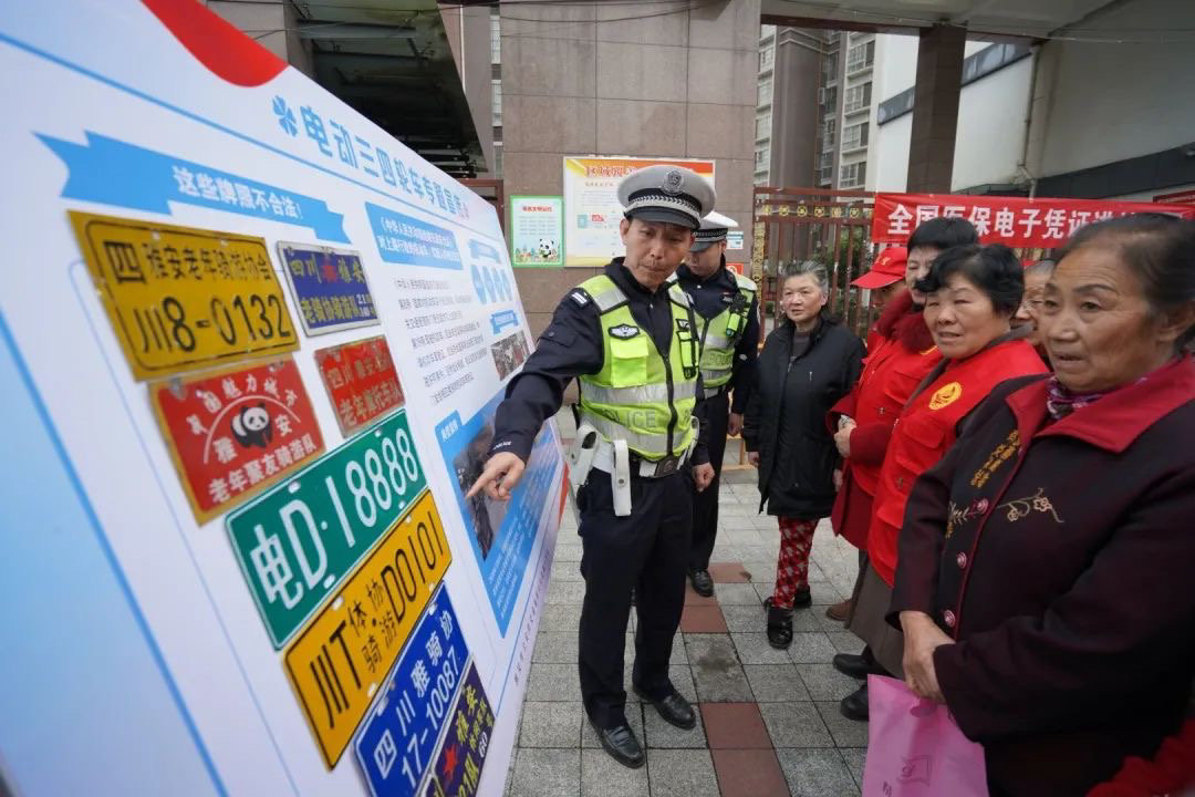 除了常规的硬性处罚,雅安交警还进行了一些柔性执法的创新。去年以来,交警部门定期到老旧小区、老年协会、老年骑游队、老年大学等场所开展宣讲,普及交通安全法规,以及老年代步车的安全隐患。在日常宣传中,交警整理出五花八门的“车牌”,以图片集锦的形式普及违法牌照;将相关典型交通事故制作为警示片,在新媒体、电梯广告、广场LED显示屏播放;免费发放便携式反光手环,增加老人夜间和雨天出行安全。