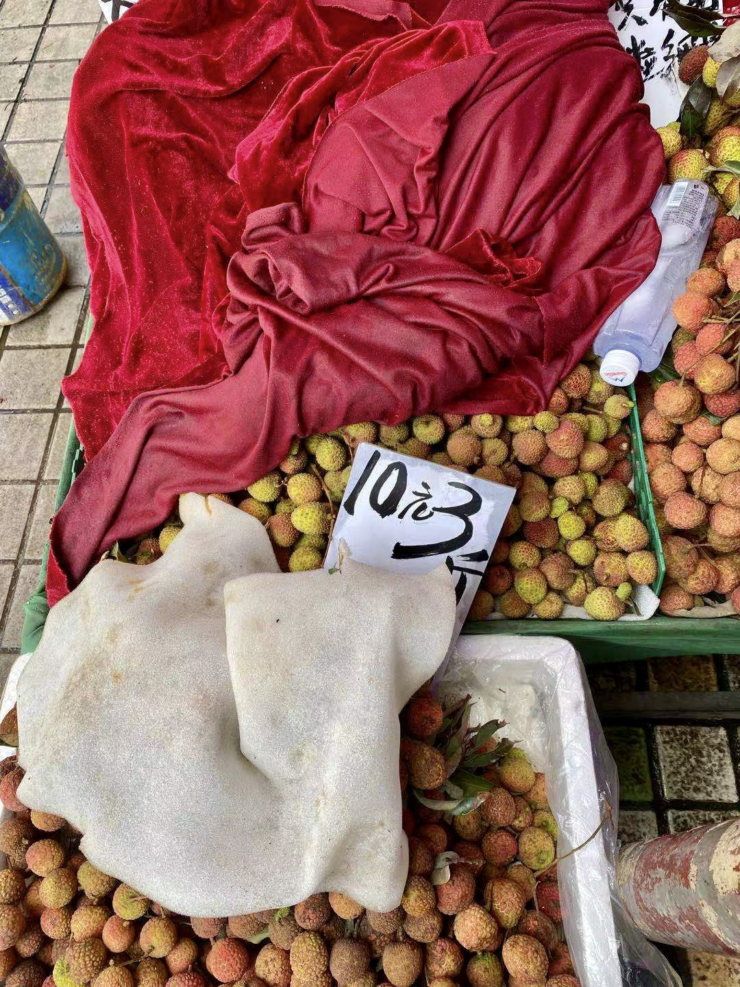 不出百米,又见另一名商贩吆喝,“便宜卖了,新鲜荔枝,10元一斤。”