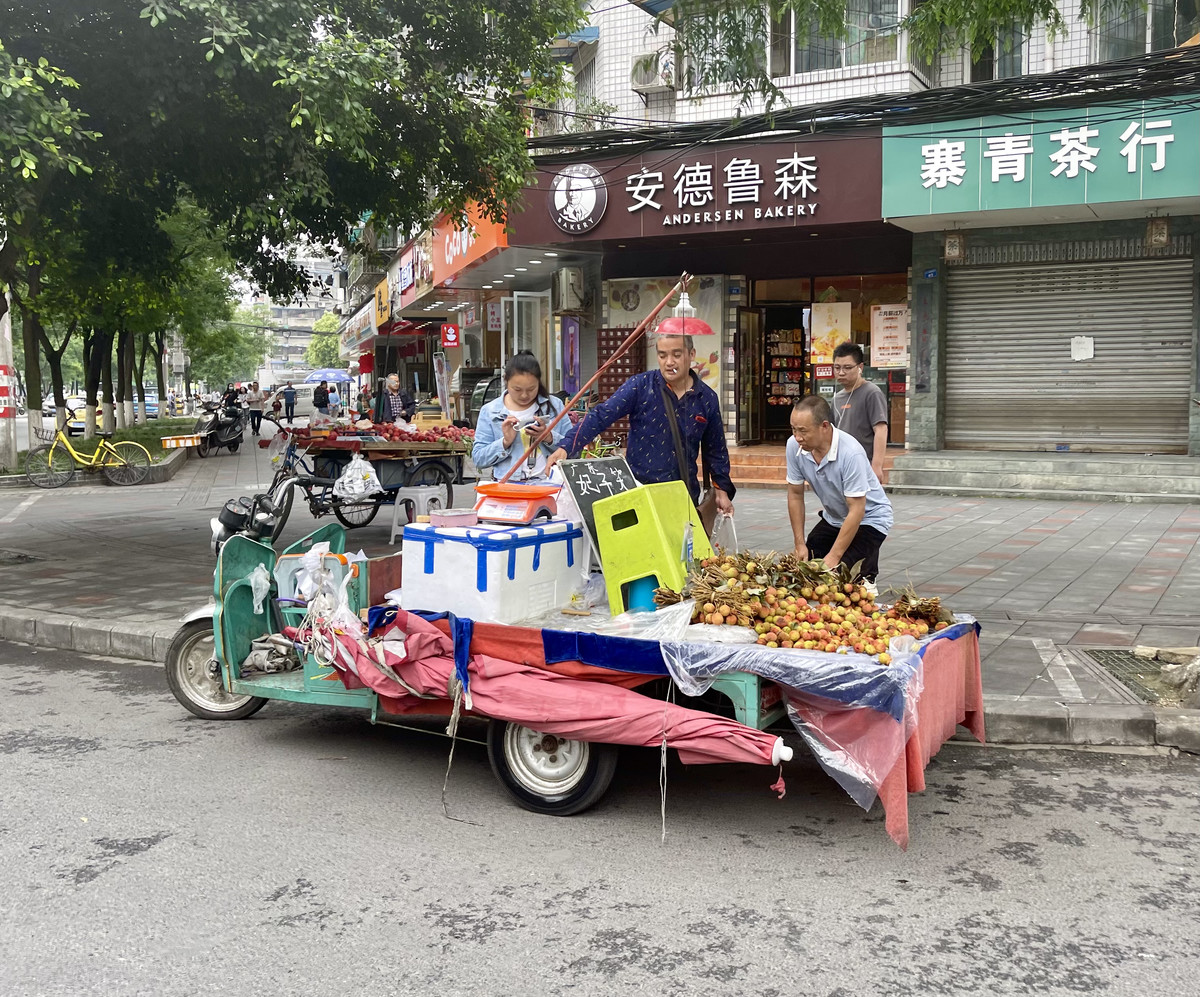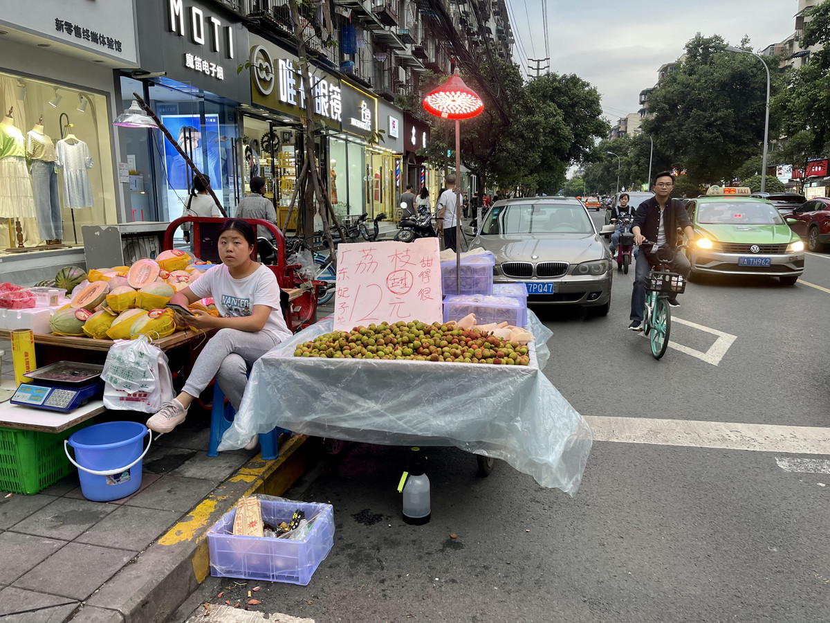 “广东拉来的妃子笑,12元一斤,不泡冰水,甜度高、一口爆汁。”5月26日,在成都4号线草堂北路地铁站出口,商贩站在一车荔枝前热情地招徕生意。