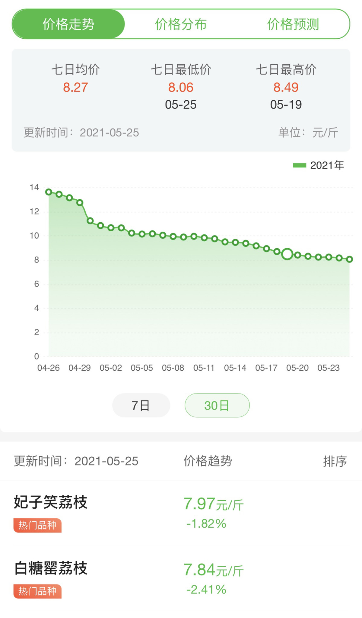 据慧农网数据显示,近30天内,全国荔枝价格走势从13.63元/斤下跌至8.06元/斤。其中,妃子笑和白糖罂两个最常见的品种跌幅明显。