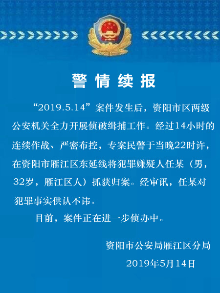 5月14日清晨,资阳市雁江区江南半岛发生一起绑架案。接到报案后,资阳市区两级公安机关抽调警力成立专案组,展开调查和抓捕工作。当晚凌晨,资阳市公安局雁江区分局发布警情通报,经过14小时的连续作战、严密布控,专案民警于当晚22时许,在资阳市雁江区东延线将犯罪嫌疑人任某(男,32岁,雁江区人)抓获归案。经审讯,任某对犯罪事实供认不讳。目前,案件正在进一步侦办中。