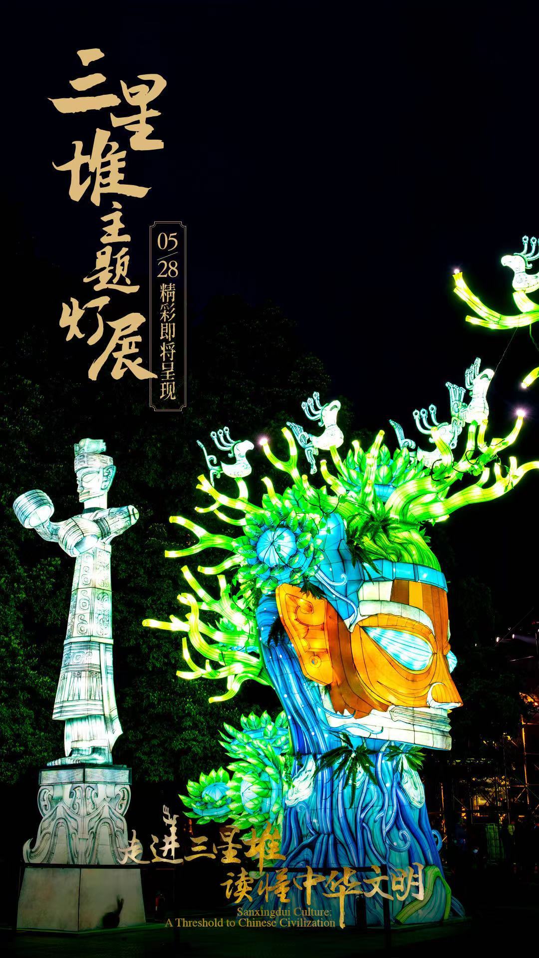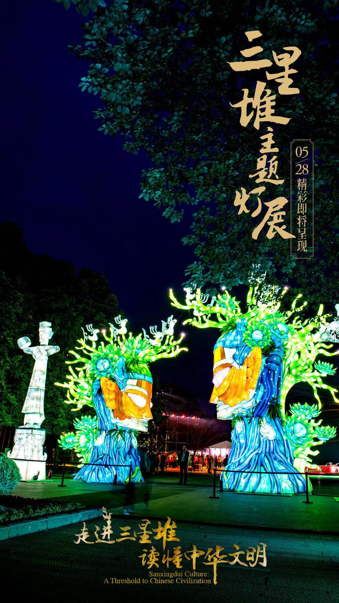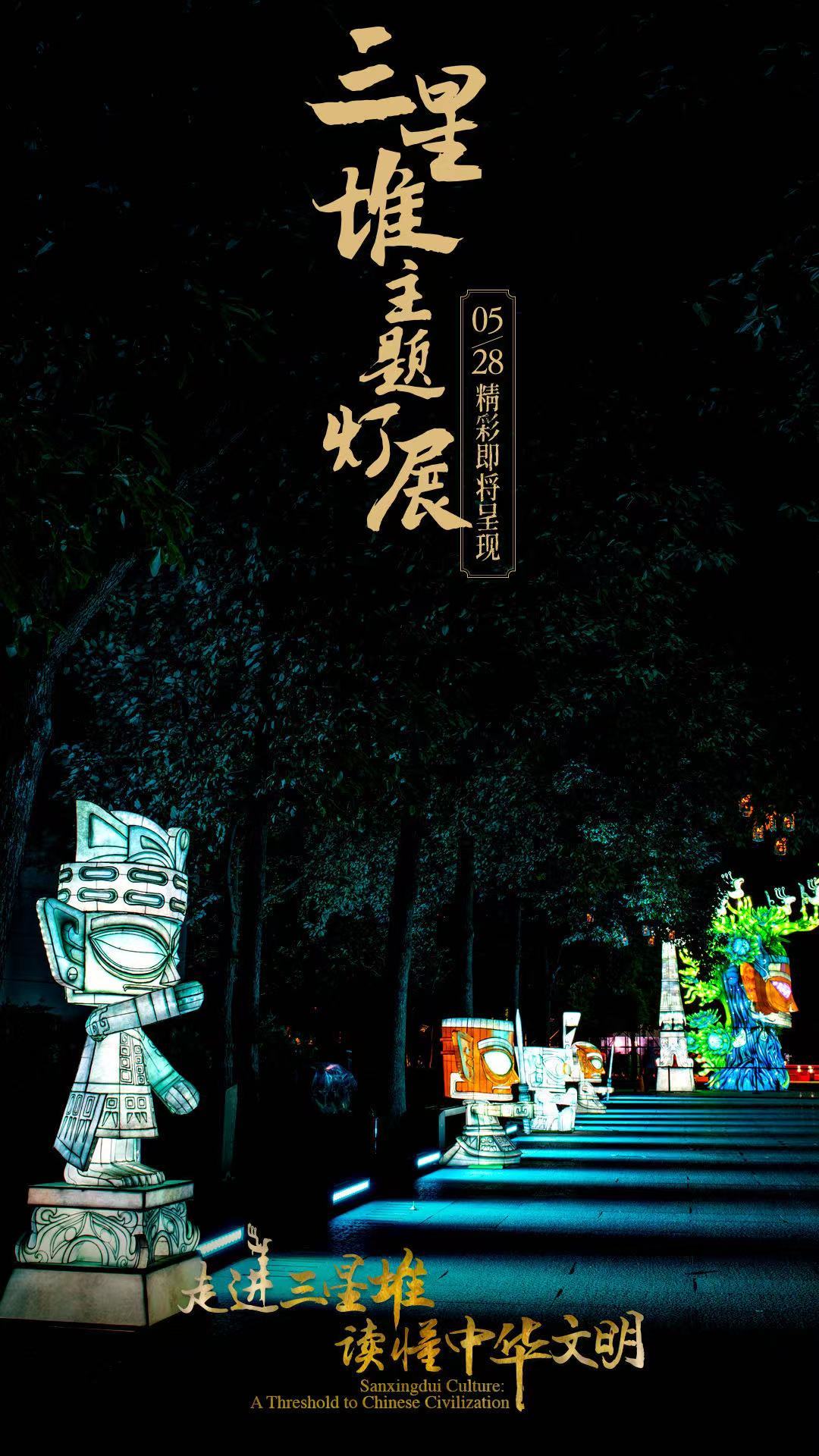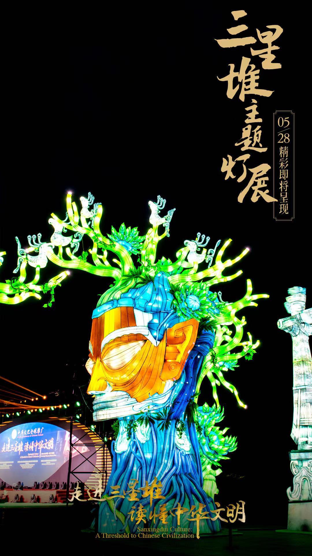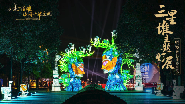 5月28日,国务院新闻办公室、国家文物局、四川省人民政府将在四川省广汉市的三星堆博物馆联合举办“走进三星堆,读懂中华文明”主题活动。由中青旅联科策划、自贡灯贸集团倾力打造的“三星堆奇妙夜之古蜀之门”沉浸式主题灯展,营造出一个如幻如梦的古蜀胜境。