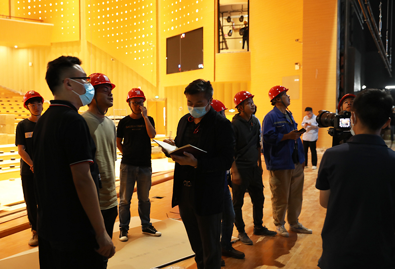 下午2点,导演组来到位于四川轻化工大学李白河校区的盐都大剧院(暂定名),对现场环境进行了解。北京大学艺术学院民族音乐与音乐剧研究中心制作人、音乐剧《红梅花开》执行监制孙维光,本剧舞台技术总监、中国歌剧舞剧院王辛刚团队成员田民杰查看舞台布局、灯光、音响等设施设备。