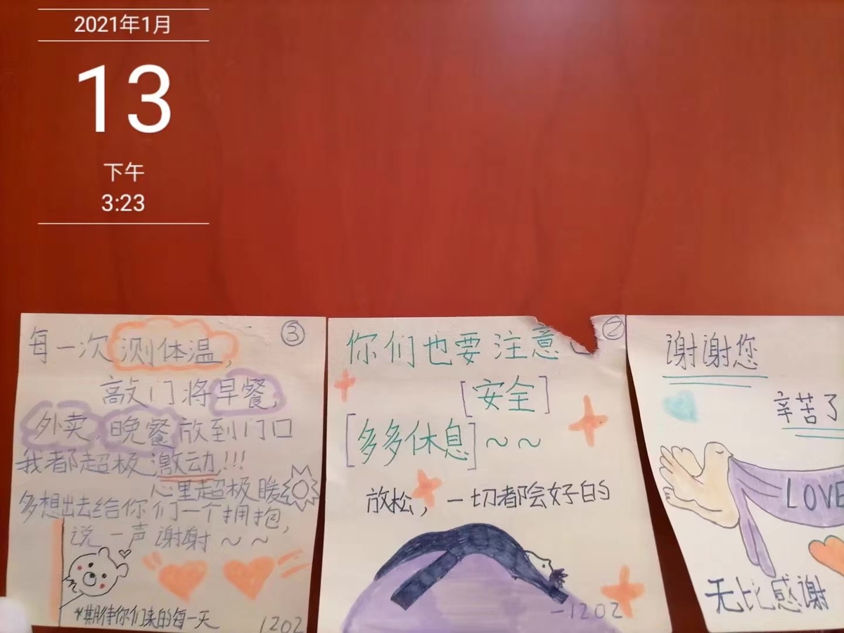 “不知已经入住多少天了,但已经慢慢习惯。虽然从未见过你们,但已熟知你们每一个眼神。”“走的那一天,我一定会非常不舍的”……在卢丽英值守的隔离酒店1202号房门上,每天都会出现一张小贴纸,上写一句鼓舞人心的话,这名来自加拿大的留学生,在卢丽英在酒店值班期间给了她莫大的温暖。