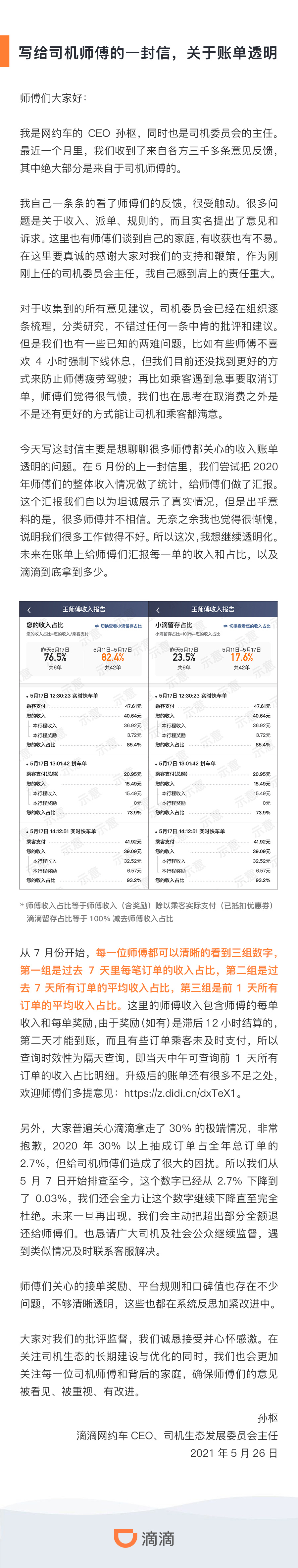 5月26日,滴滴网约车平台公司CEO、司机生态发展委员会主任孙枢发布了一封写给司机师傅的信,表示将推动滴滴司机账单透明化,公开每笔订单留存情况。