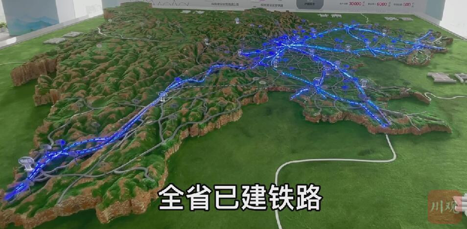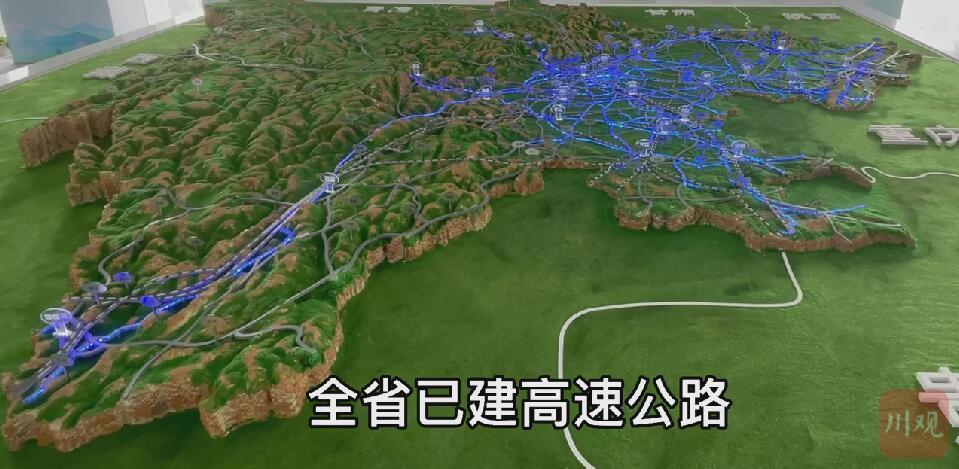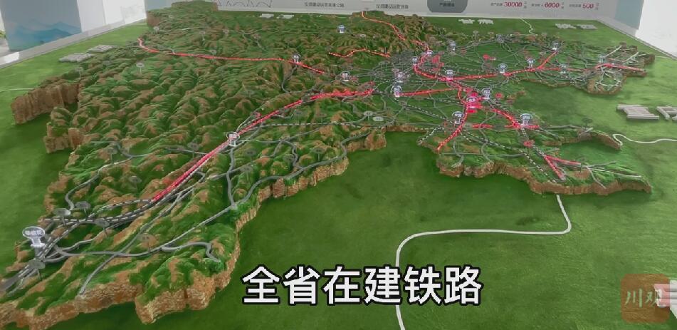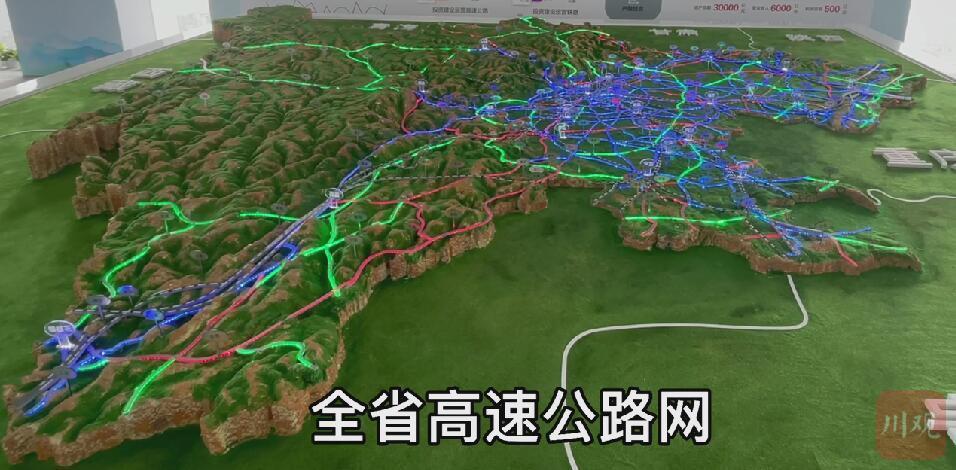 在5月28日的蜀道集团揭牌活动上,一个巨大的沙盘引人注目。沙盘上,按照1:20万的比例,完整复制了四川的地形地貌,起伏山峦间,一条条“道路”延伸其间。