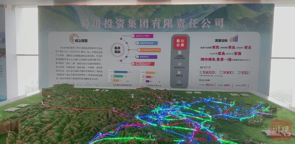 与沙盘并列放置的,是刚刚揭牌的蜀道集团简介。组建蜀道集团,是为了进一步优化交通产业布局,提高企业资源配置和运营效率,充分发挥省属国有资本在交通产业领域的战略支撑作用,更好推动“四向八廊”战略性综合交通走廊建设,助力实现“交通强省”目标。