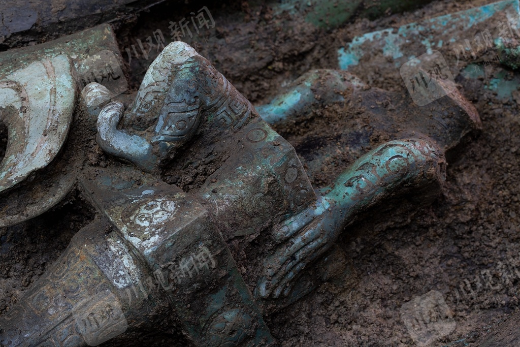 有意思的是,顶坛人像上除了手臂,还有像脚一样的造型。这双脚又来自哪里?杨镇介绍,目前脚的另一面似乎还有什么东西,但现在被遮无法确定。这件“奇奇怪怪的文物”,只有完全清理完成后才能确认准确性质。