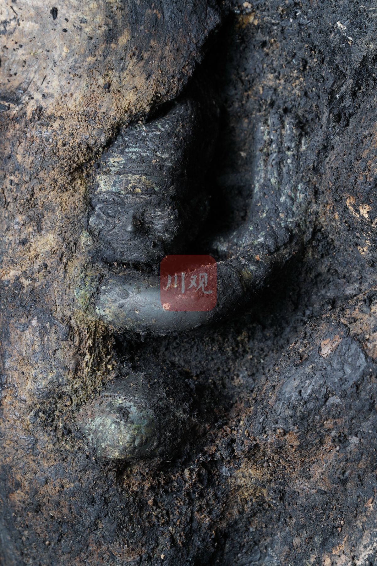 川观新闻记者看到,这3件人像双手呈合十状,头向右转,脸部特征也和三星堆大多数青铜人头像的风格并不相同。