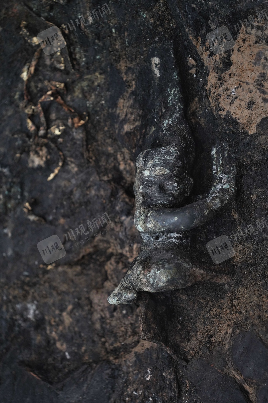 更加让许丹阳感到惊喜的是,这3个人像的造型、大小几乎完全一致,而且头顶同一部位都连接有残断的凹槽状铜条。这意味着,这3件人像很可能不是单独的个体,而是1个大型组合铜器的3个构件,坑里还发现有一些散布的条状铜器,应该也是它的组成部分。3个人像可能只是这件组合铜器的支脚,它们头上通过连接的铜条共同顶着什么东西。如果后期能够把它的残片都找到并复原出来,肯定也是很令人震撼的一件器物。