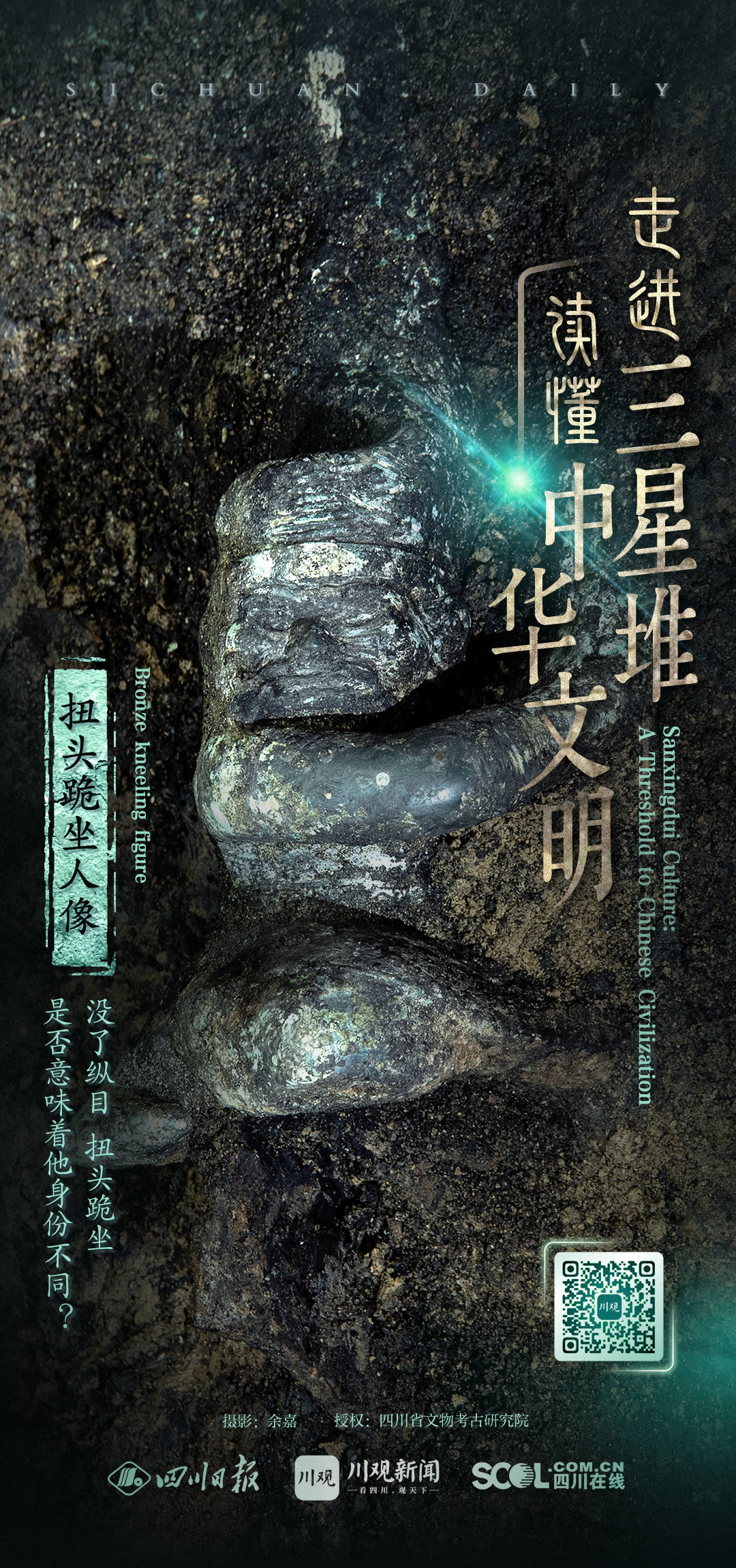 4号坑跪坐人像(右),四川省文物考古研究院供图 摄影:余嘉