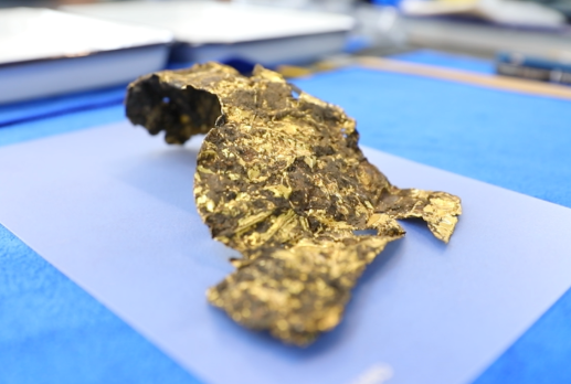 这件黄金面具仅保留了四分之一,不过还能看出右耳、下巴等轮廓。这件面具推测整张脸宽15厘米,发现时卷曲在灰烬层中,推测仍是某件戴金面具砸损脱落所致。