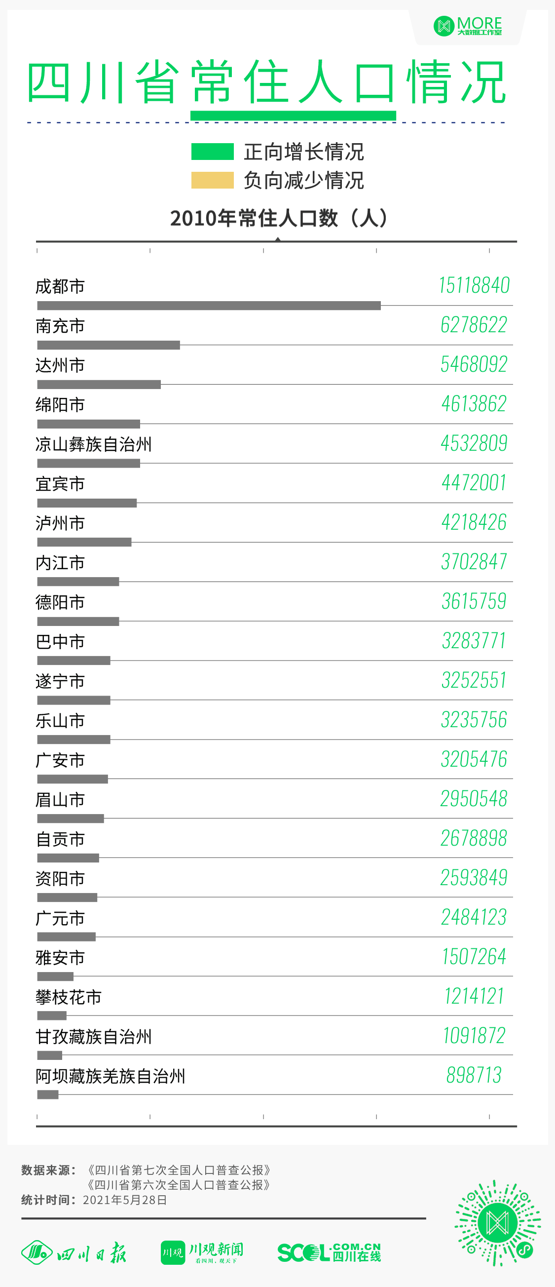 第七次全国人口普查数据发布,四川全省常住人口8367.5万人,位列全国第五位,同比2010年第六次全国人口普查数据,增加了325.7万人。除了省会城市成都常住人口增长明显外,部分区域中心城市常住人口数量也有较大增长。