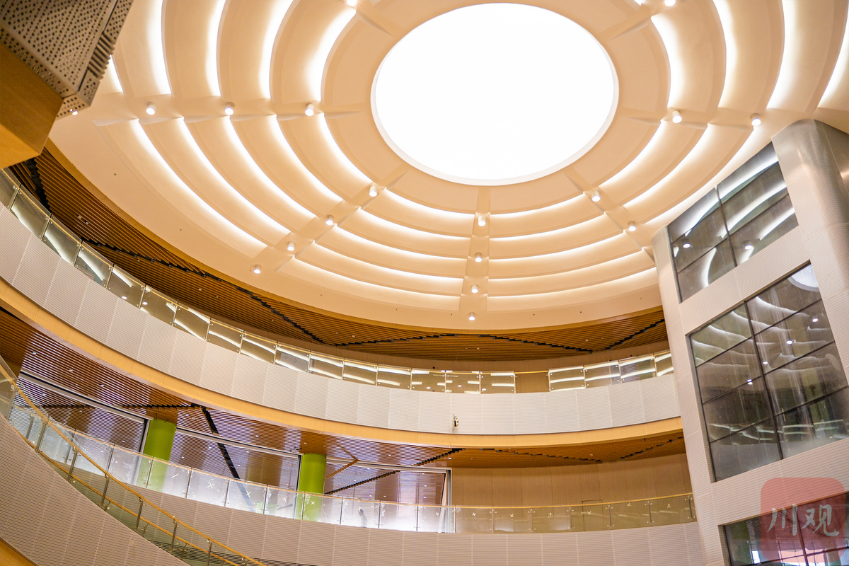 5月28日,走进内江师范学院新校区项目最具标志性的图书馆中,只见大厅内一道弧形阶梯盘旋而上,阳光通过穹顶中央的透明玻璃照射进来,使整个图书馆内部显得格外明亮大气。