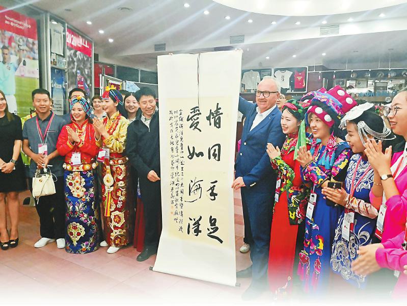 2018年9月9日,四川青少年赴俄交流团向“海洋”全俄儿童中心赠送书法作品,表达中俄友好情谊。图据人民日报▼