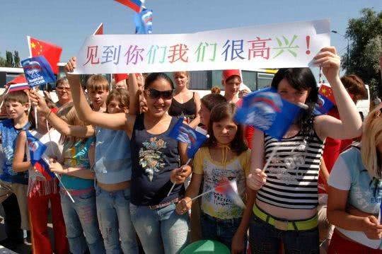 2008年7月17日,俄罗斯鄂木斯克人民在街头迎接前往疗养的四川灾区孩子▼