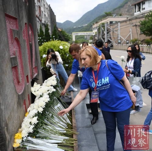 2019年5月15日,在北川老县城遇难者公墓前,“海洋”全俄儿童中心教师来华访问团成员们,向地震遇难者敬献鲜花,静默肃立、鞠躬致敬。▼