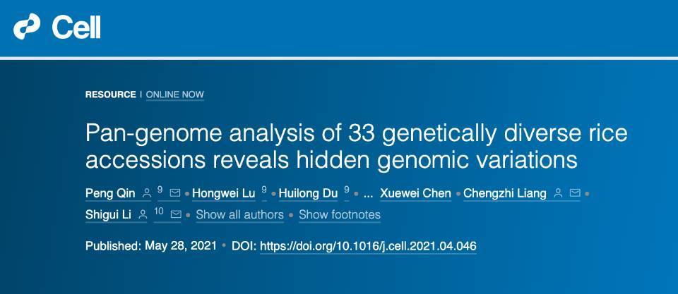 这一研究成果以《基于33个水稻遗传多样性材料的泛基因组分析揭示“隐藏”的基因组变异》为题,于北京时间5月28日深夜由国际著名学术期刊《细胞》(Cell)在线发表。