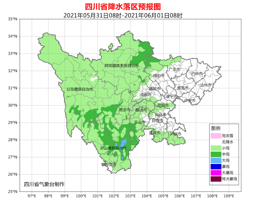 6月1日白天到晚上,盆地大部多云,其中广元、巴中、雅安、乐山、内江、自贡、宜宾、泸州8市的部分地方和广安、资阳2市南部及绵阳、德阳、成都、眉山4市西部多云间阴天有阵雨;川西高原和攀西地区阴天间多云有阵雨或雷雨,其中阿坝州南部、甘孜州东部有分散中雨,凉山州东部和中部有中雨,个别大雨。
