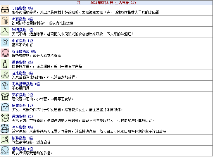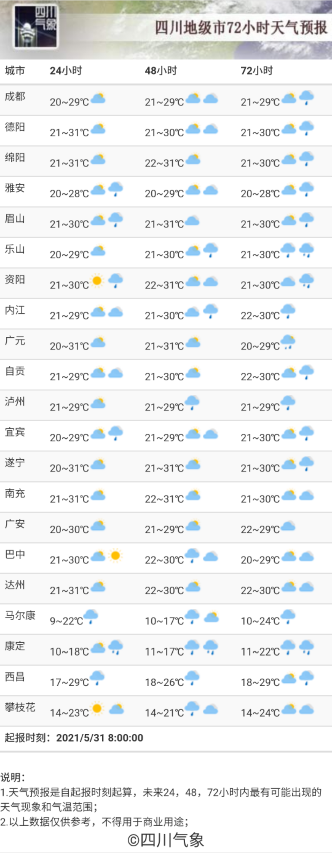 今天(5月31日)白天,盆地大部多云间晴,其中西部沿山和南部山区多云间阴天有阵雨;川西高原大部及攀西地区阴天间多云有阵雨或雷雨。
