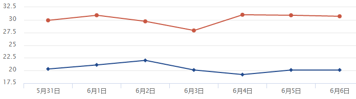 5月31日(周一)最低气温21~23℃,最高气温30~32℃;6月1日(周二)最低气温22~24℃,最高气温31~33℃;6月2日(周三)最低气温23~25℃,最高气温32~34℃。