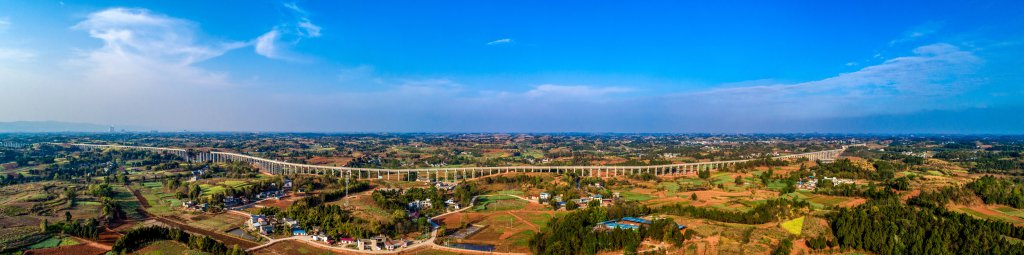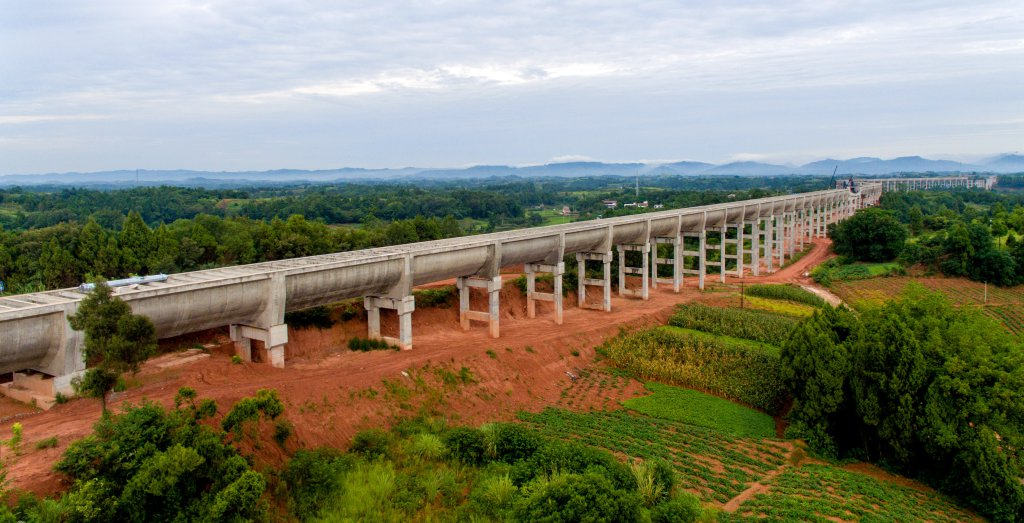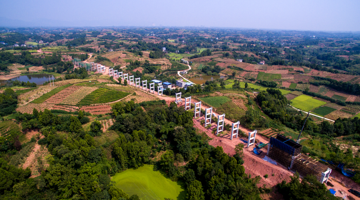 图为毗河供水一期工程建设的蒋铜渡槽,长度约为5.5公里,共347跨,位于简阳市境内,是目前国内最长的单座渡槽。