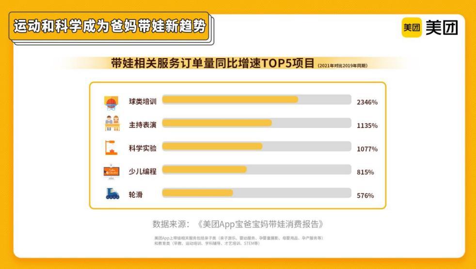 同时,80、90后成为宝爸宝妈主力。他们更注重孩子的全面成长,因此也推动运动和科学能力培养成为新流行,球类培训、科学实验和少儿编程等相关服务的订单量呈现10倍以上的爆炸式增长。