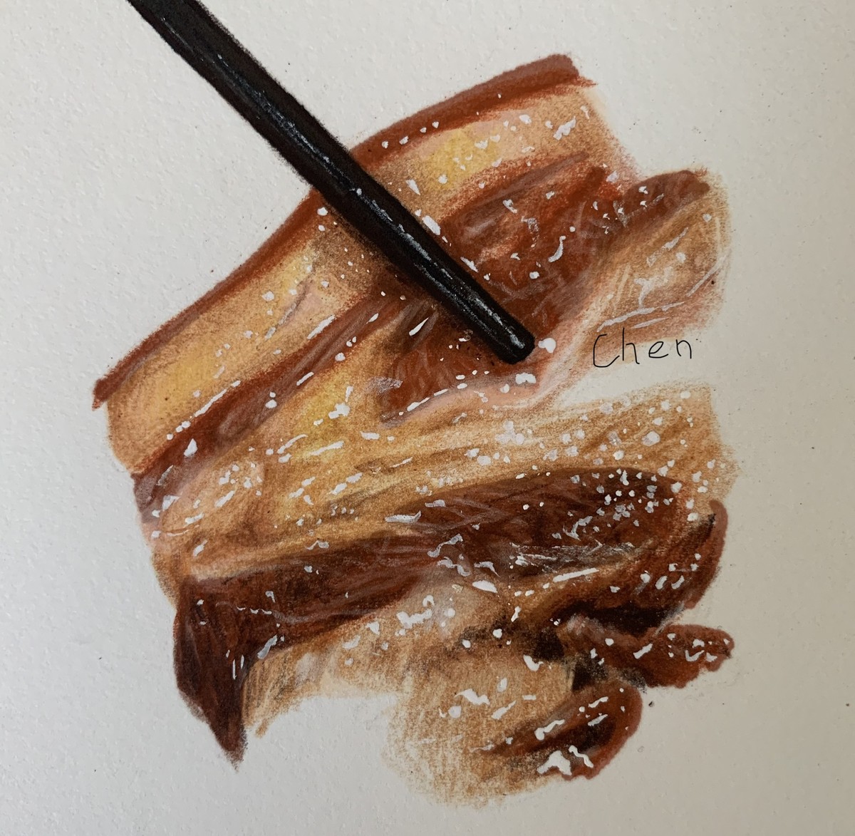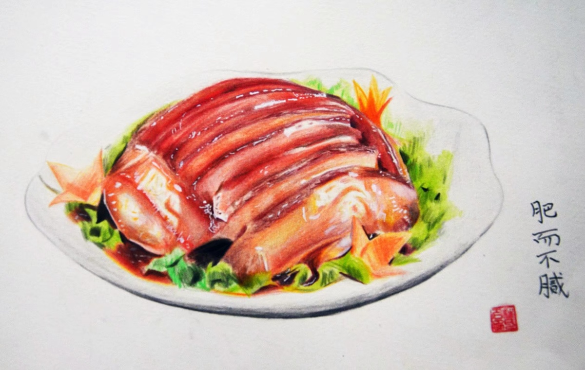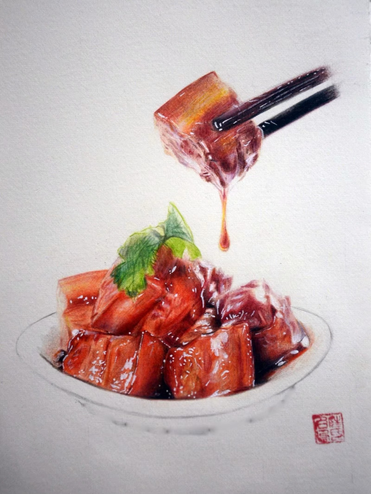 陈兰岚在纸上画的第一道菜是一盘红烧肉,那时她还在念大二,“我是一个资深吃货,但女孩子嘛又要减肥,不能吃太多东西。很馋肉怎么办,只能去画它。画的时候就告诉自己已经吃了!”画完后,陈兰岚觉得很好玩,就拍照分享了朋友圈,没想到直接炸圈了,朋友们纷纷留言:我!也!要!吃!