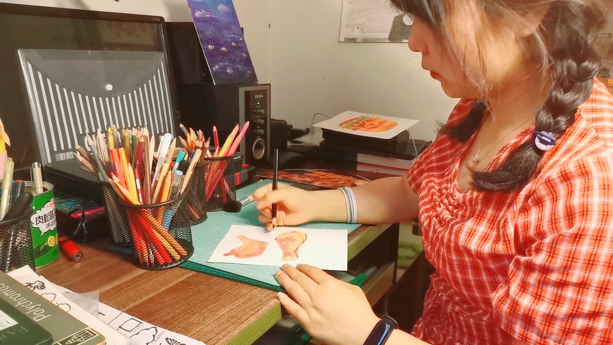 “美食手绘的秘诀说起来很简单,一是快速钩形,二是用马克笔在白纸上铺一层底色,三是用彩铅上色。”向记者分享经验的时候,陈兰岚俨然是一名老师傅,“切记,重点是立体效果,‘灵魂’是阴影和高光是。”