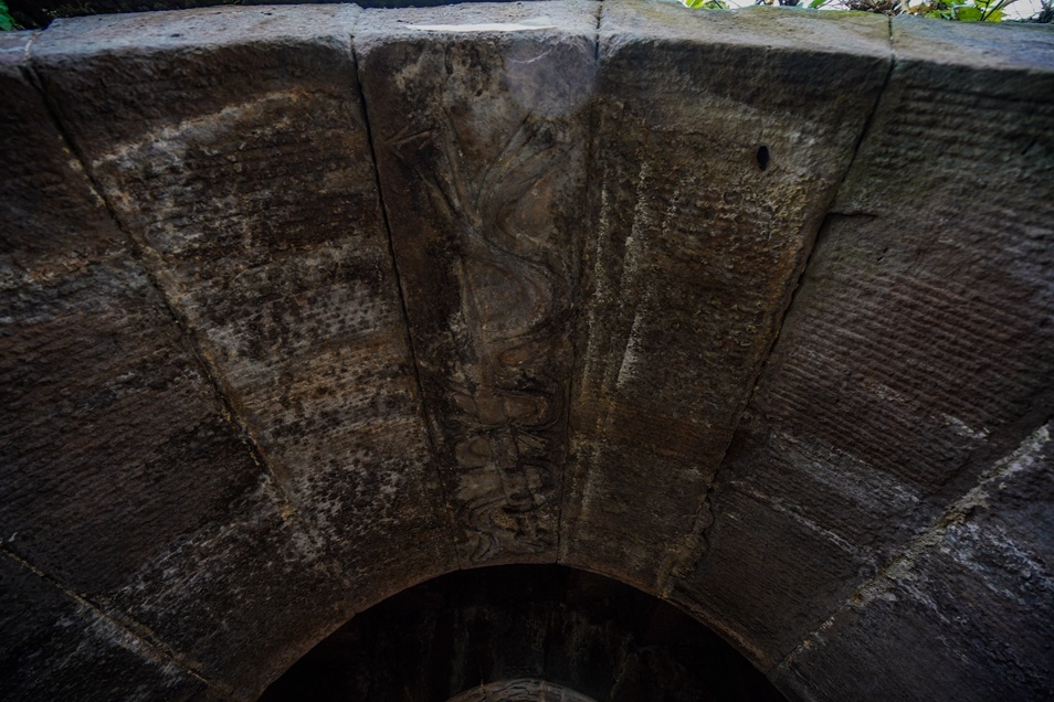 东门外的红、白菱池,如今一座改成了鱼塘,一处种上了水稻,继续发挥着作用。东门城墙,两侧城墙延丘陵一路逶迤,长约数百米。站在城门洞,可以明显看到城墙下端以楔形石条丁砌而成,城墙厚约1米左右,石头虽然风化严重,仍能看出明显宋代城墙的特征。到了城墙上端,便可看出石头砌筑方法略显不同。在城门内拱顶部,浮雕了金线葫芦和祥云,外拱顶部则雕刻了出鞘宝剑,剑柄装饰鱼鳞纹,两条飘带系于剑鞘中部。东门之内为一圈凹地,城墙和城内土埂形成了类似瓮城的结构,增强了防御能力。