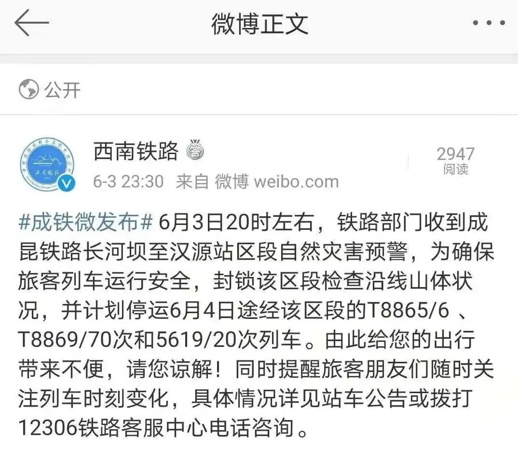 据中国铁路成都局官方微博@西南铁路消息:6月3日20时左右,铁路部门收到成昆铁路长河坝至汉源站区段自然灾害预警,为确保旅客列车运行安全,封锁该区段检查沿线山体状况,并计划停运6月4日途经该区段的T8865/6 、T8869/70次和5619/20次列车。