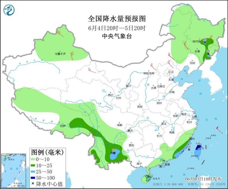 6月4日20时至5日20时,黑龙江南部、吉林东部、云南东部、广东东南部沿海、福建东部、海南岛、台湾岛等地部分地区有中到大雨,其中,福建沿海、台湾岛等地局地有暴雨(50~60毫米)。新疆北部和东部、内蒙古、甘肃河西等地部分地区有4~6级风。