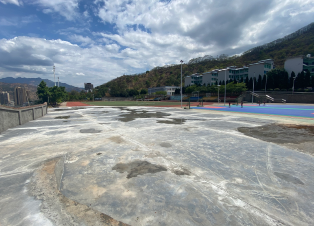 6月4日,攀枝花市米易县闻道中学的运动场内施工队伍正进行修复作业。站在场边,校长杨洪连说心里的一块石头终于落了地,“铺完水泥过一段时间就可以铺塑胶投入使用了,学生们跑步再也不用绕道了。”