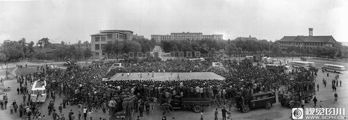 恢复高考后,四川大学内,新生们正在进行一场篮球比赛。