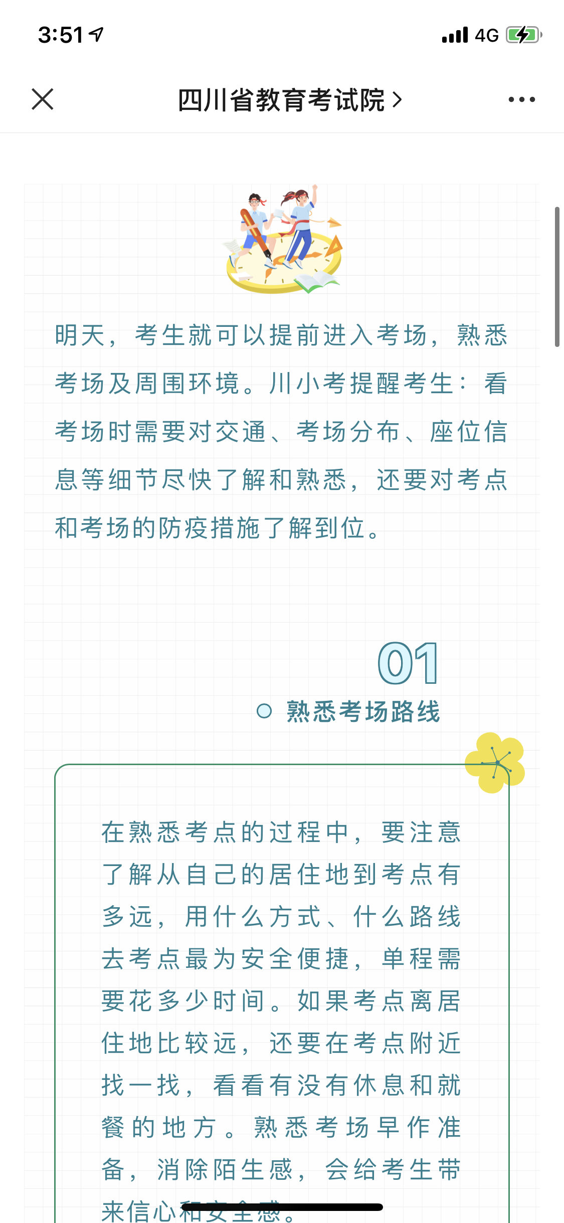 熟悉考场时,一定要从住所出发,也就是说沿着赴考路线走一遍。算一算,从住所到考场需要多长时间。为了不耽误考试,考生和送考人员,一定要掌握好时间,尽量错开出行高峰期到达考点。路途一定要注意安全,避开高危路段。