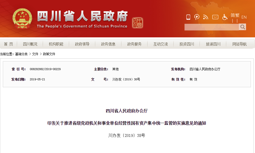 日前,四川省政府办公厅印发《关于推进省级党政机关和事业单位经营性国有资产集中统一监管的实施意见》,明确将坚持政府公共管理职能和国有资产出资人职能分开,除省政府授权的有关部门或机构外,其他省直部门、群团组织和事业单位原则上不再履行企业国有资产出资人职责。