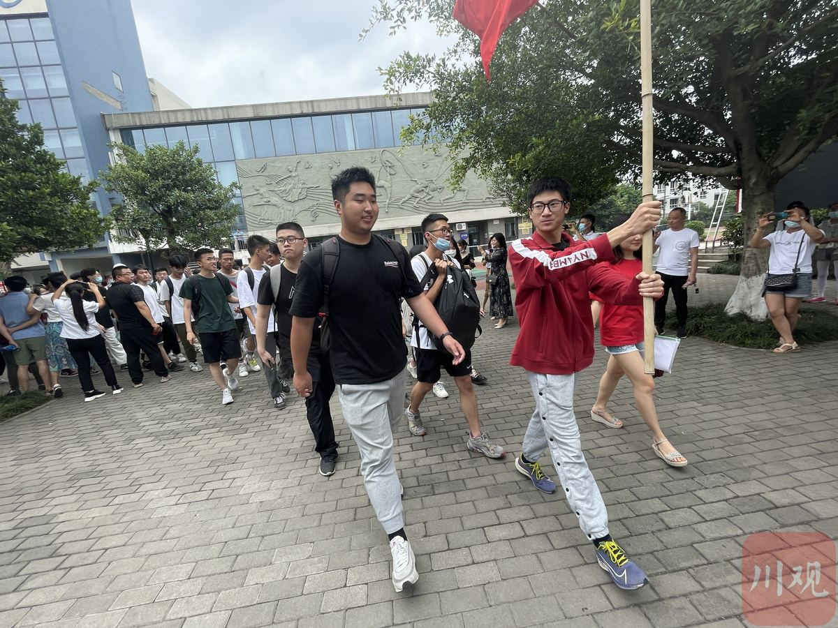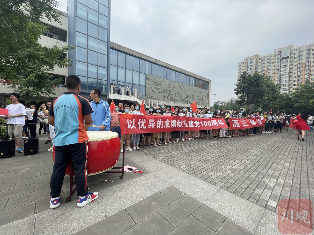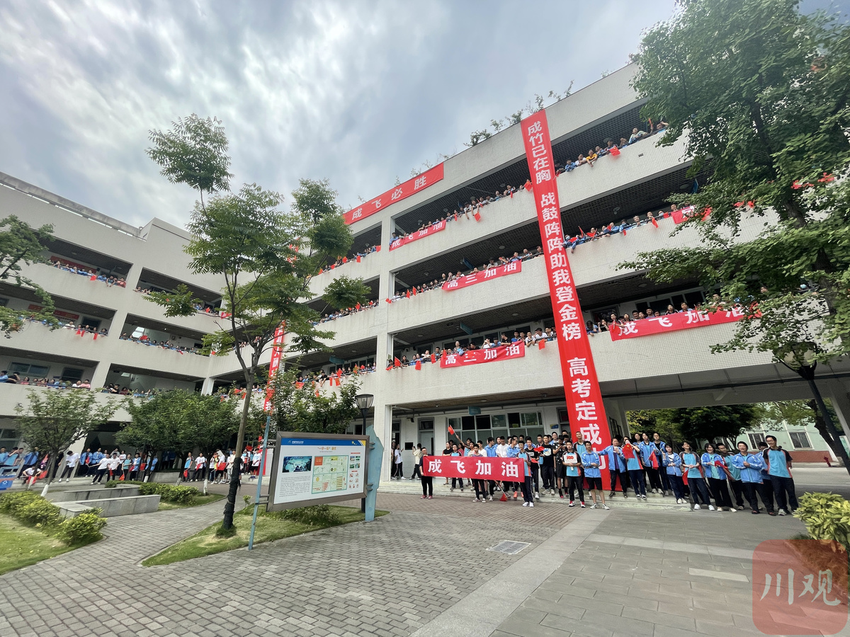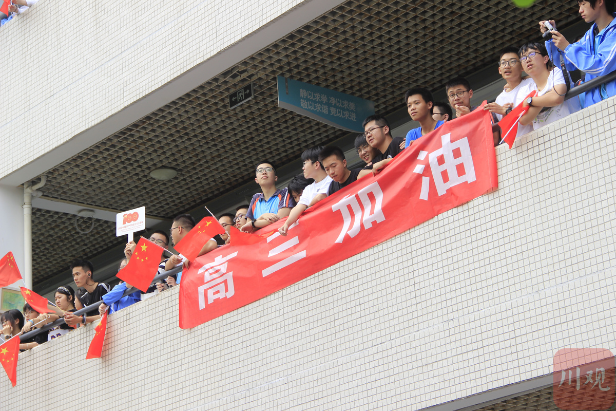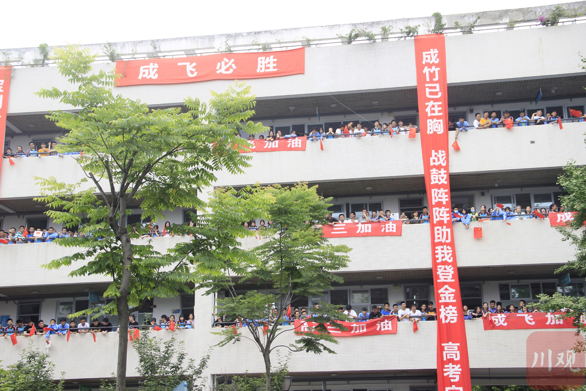当日下午,成都市成飞中学内,锣鼓声、加油声,此起彼伏。教学楼两旁则挂着红色横幅标语,写着“宝剑今出鞘 我辈必题名”。不仅如此,该校高一高二的学生特意赶回学校,护送该校高三考生“出征”,为他们加油打气!
