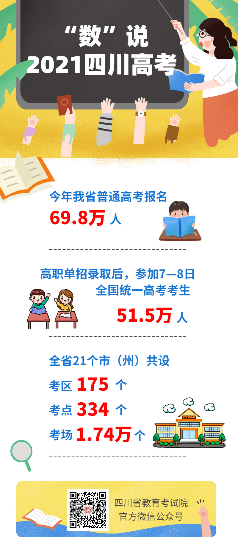6月7日上午,川观新闻记者在四川省2021年全国普通高考工作调度视频会上获悉,今年我省普通高考报名69.8万人,较上年增加2万人,高职单招录取后,参加7至8日全国统一高考考生51.5万人。全省21个市(州)共设考区175个,考点334个,考场1.74万个,考试工作人员(含监考教师)8万余人。