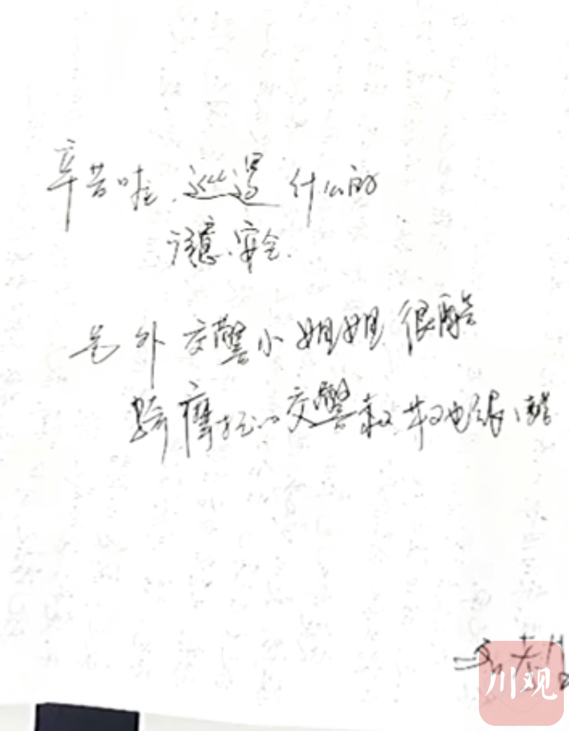 纸条上面写着“辛苦啦,巡逻什么的,注意安全。交警小姐姐很酷,骑摩托的交警叔叔也很酷。”这让收到感谢纸条的执勤交警非常感动。