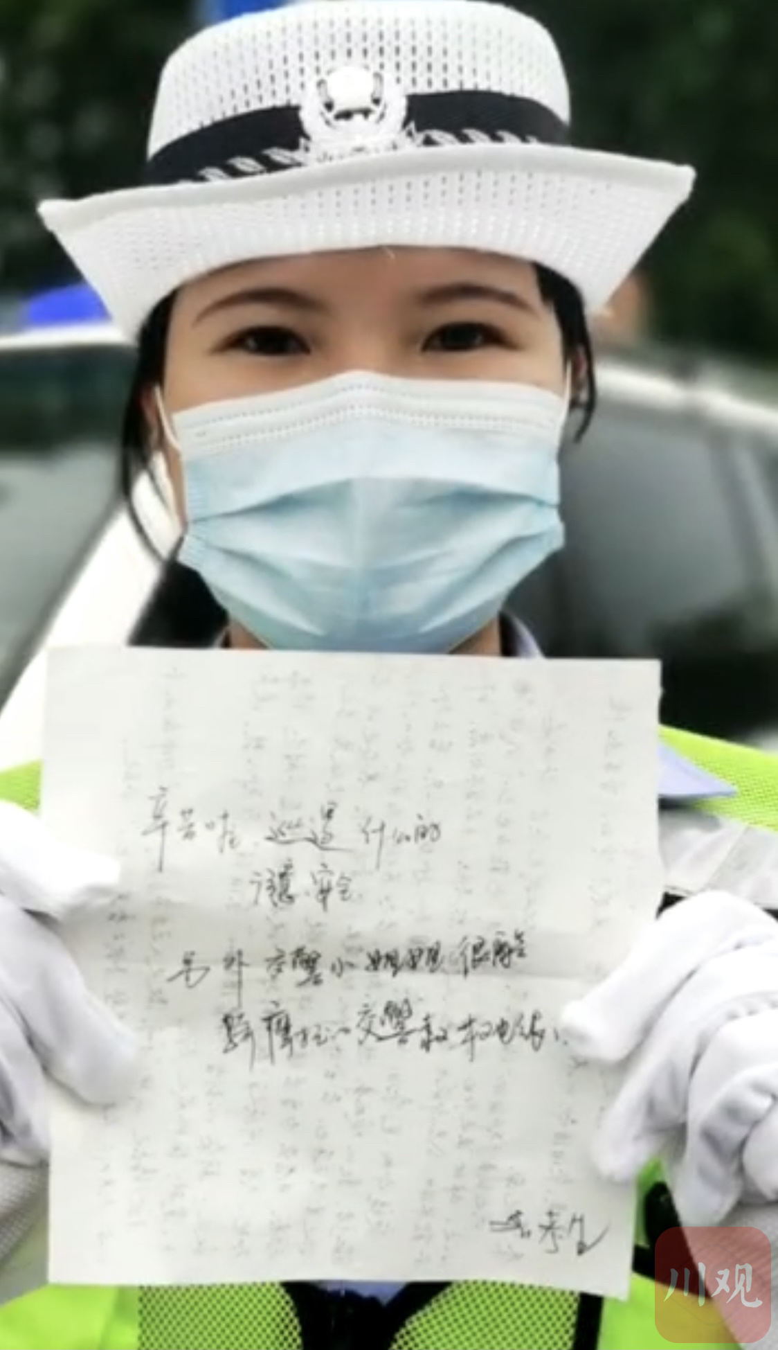 6月7日上午8时许,四川南充一中华凤校区考点外,一名考生突然冲出人群,跑向正在门口执行高考服务保障任务的执勤交警易佳,随后递给她一张纸条,并说了一声“辛苦了”。
