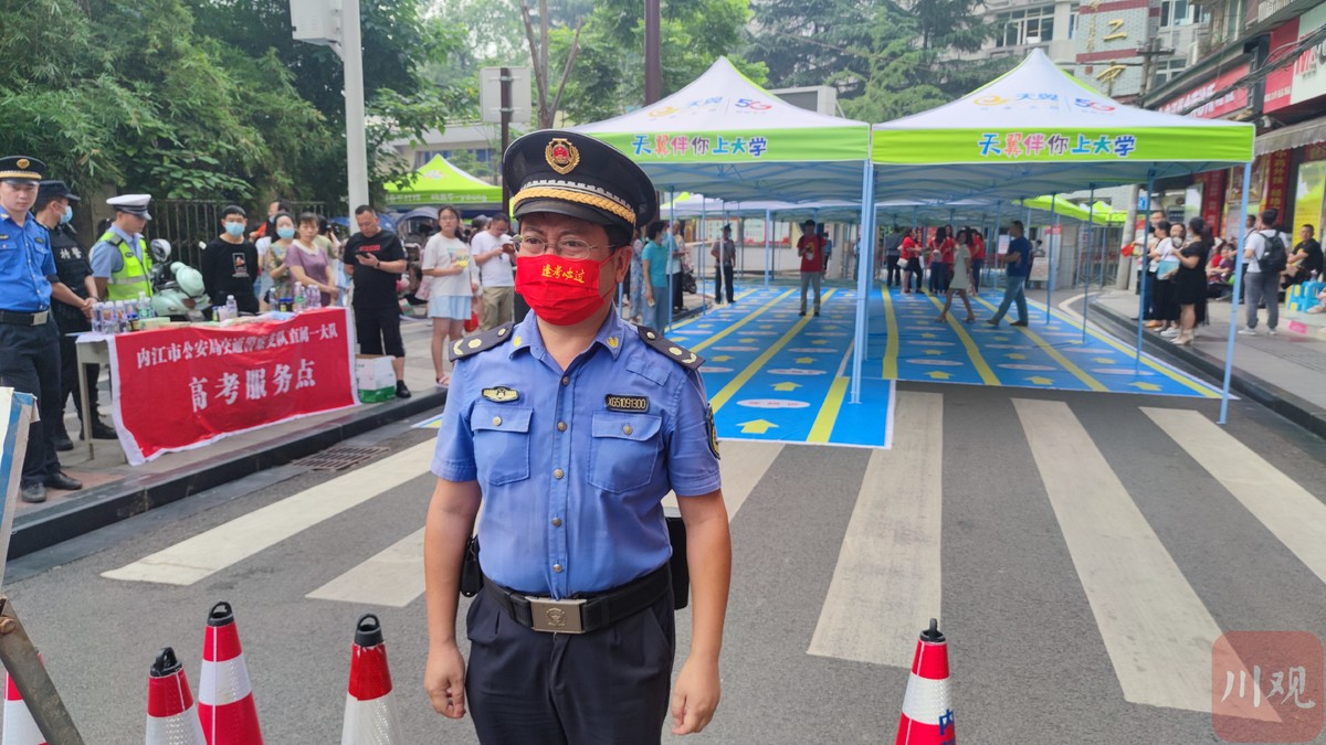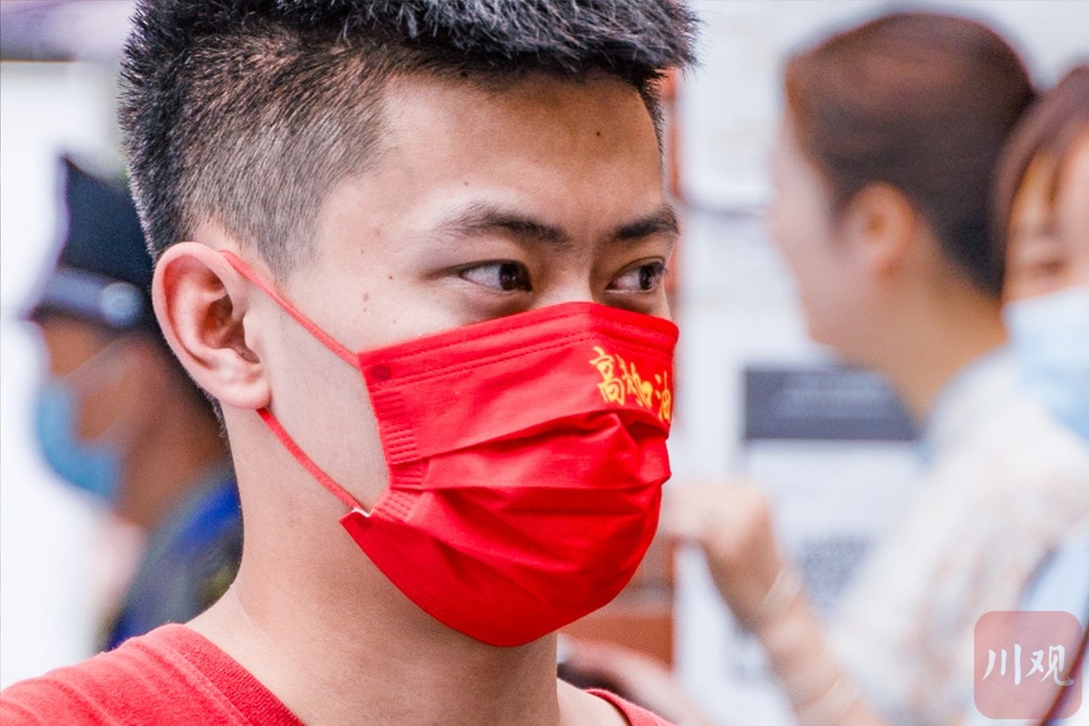 内江市市中区城管执法大队二中队城管协管员周忆负责维护二中考场外的秩序及市容市貌。他还戴了一只红色的口罩,上面印着“逢考必过”。“戴着这个特殊的口罩,我也是给他们送上了祝福,考生看到了心情放松点,高高兴兴进入考场。”而为了缓解考生心理压力,内江各考点也设置了志愿者服务岗,负责为考生提供心理疏导。“今天遇到了一位小妹妹比较紧张,我带她深呼吸,边走边教她放松方法,把紧张情绪化解了,顺利进入考场。”二中考场志愿者邓成琼介绍。